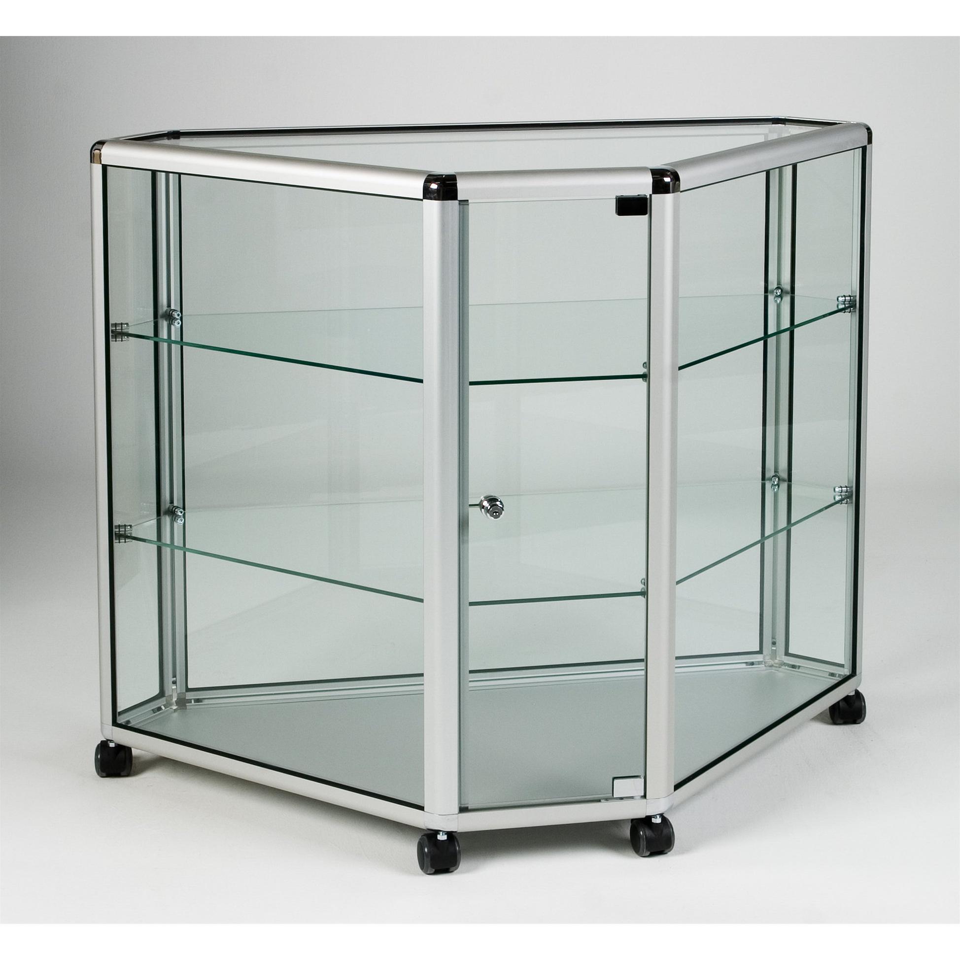 Floor standing locking showcase • brushed aluminium frame • polished 6mm toughened safety glass • 2 x adjustable shelves • high security lock • lockable twin wheel swivel castors • dimensions 900mm high x 810mm wide x 810mm deep.
