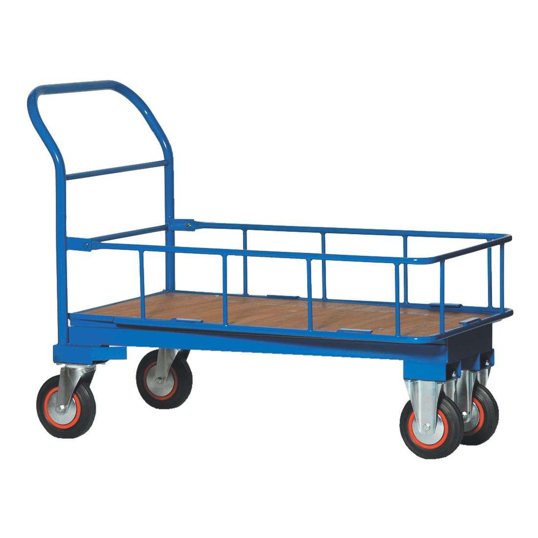 This powder coated nesting trolley with wooden base and retractable safety cage is a great addition to our flatbed trolley range.