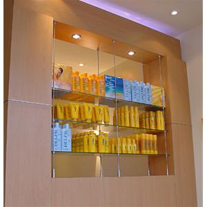 Position shelves at any height, use in the window or interior to create a stylish display. Increase the effectiveness by adding low-voltage lighting, acrylic poster pockets and leaflet dispensers.